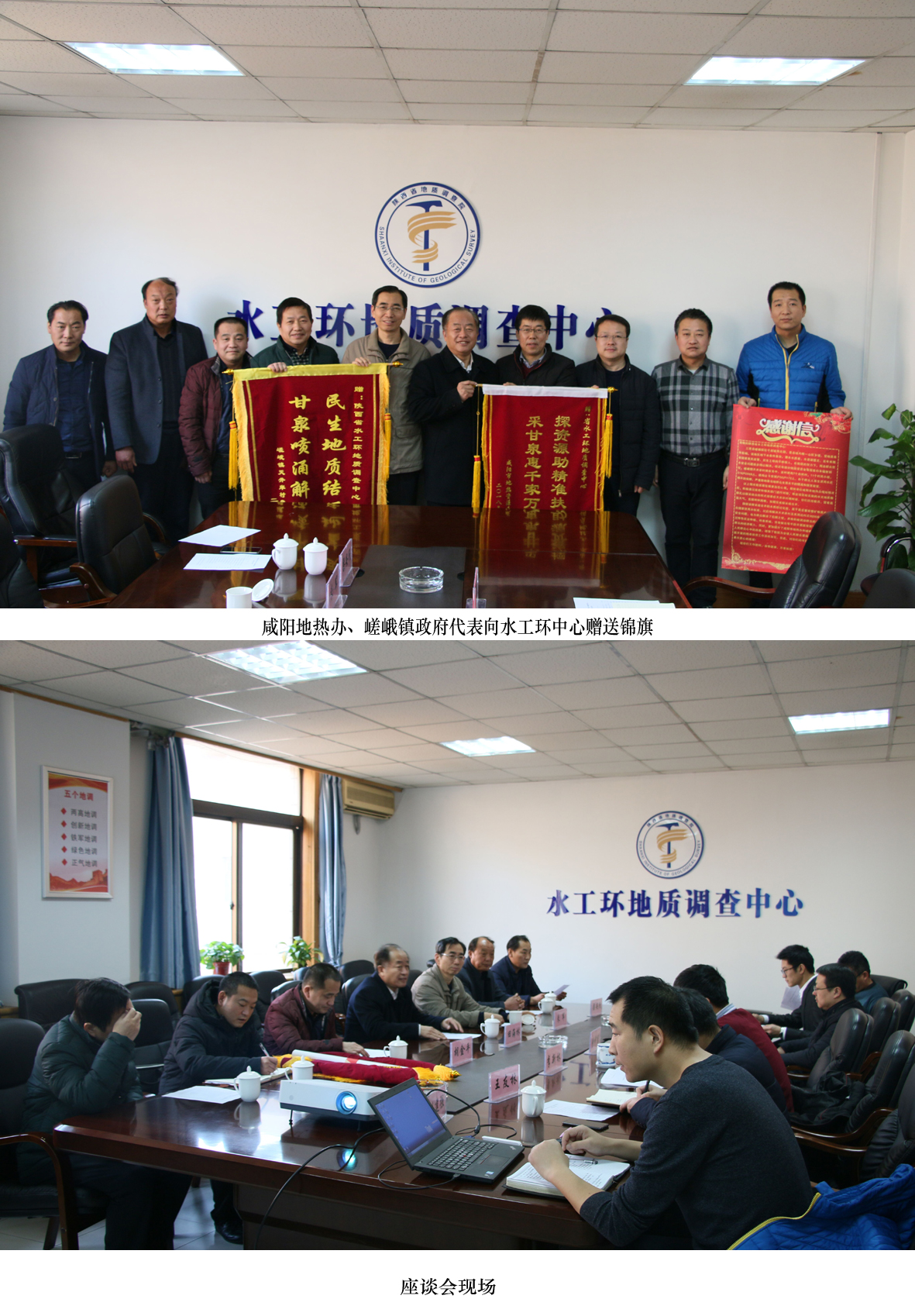 咸陽城市地質(zhì)調(diào)查項目2018年度工作中,技術(shù)人員經(jīng)過精細論證,在嚴(yán)重缺水的天齊塬地區(qū)成功實施一孔探采結(jié)合井,發(fā)現(xiàn)了優(yōu)質(zhì)的富鍶礦泉水資源,日出水量達960立方米,解決了周邊2000余人生活用水和200余畝經(jīng)濟作物灌溉問題,也為當(dāng)?shù)厝罕娒撠氈赂话l(fā)揮了重要作用。為此,1月23日,咸陽市地?zé)豳Y源開發(fā)管理辦公室攜三原縣嵯峨鎮(zhèn)人民政府和天井岸村村委會特來我中心贈送錦旗和感謝信,同水環(huán)中心有關(guān)人員進行熱烈座談。中心李新林副主任、唐亮副主任、咸陽市地?zé)徂k田海林主任、來軍副主任,三原縣嵯峨鎮(zhèn)人民政府胡金平主任、天井岸村村委會梁安平書記等參加座談。